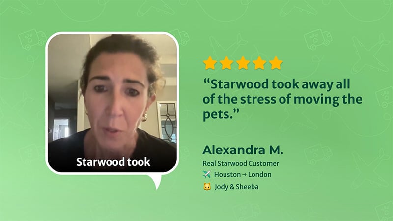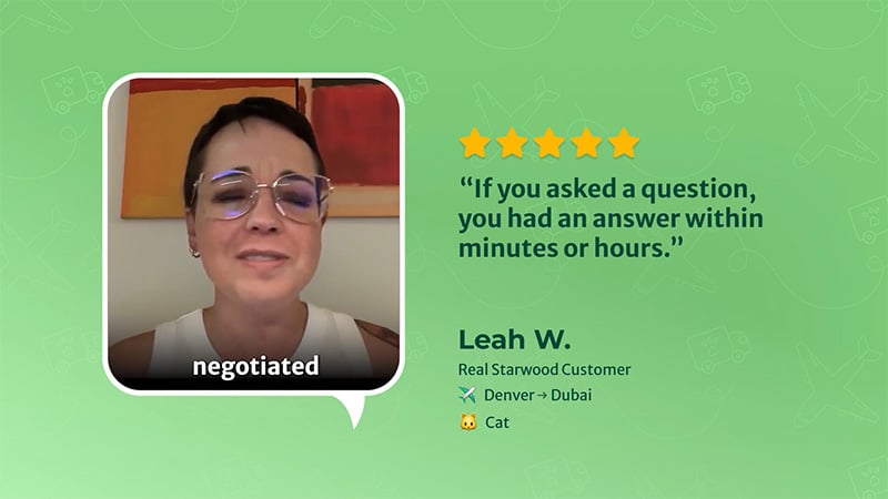 Had a great experience with Starwood! My cat made it home safely after a complex journey from Boston to Singapore. Special thanks to my agent Ryan who was patient, professional and incredibly supportive throughout the whole process. I couldn’t have done it without her and the Starwood team. Highly recommend their services!