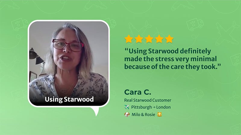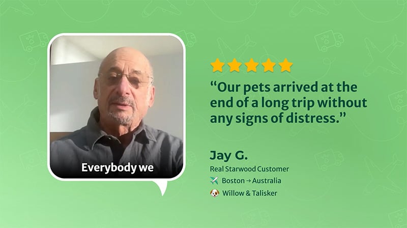 We recently moved from Seattle to Portugal. With the cost of moving, we were concerned about the cost of moving our two dogs and one cat over. More stressful was the thought of them traveling. I decided that the cost and peace of mind that everything was in order and the animals were in the best hands was worth every penny. I was not wrong. The week we left was very stressful but I never worried about my animals. Everything was ready and scheduled and I didn’t have to do any of it. Everyone on the team from start to finish was thorough with great communication so nothing was missed. From pickup to drop off everyone displayed caring for the animals and patience and understanding for the owners! I would highly recommend Starwood. They are the best.
