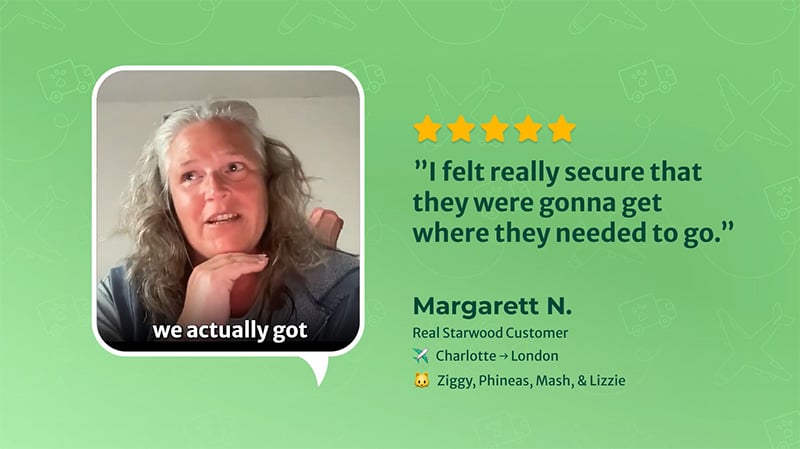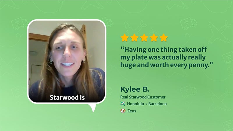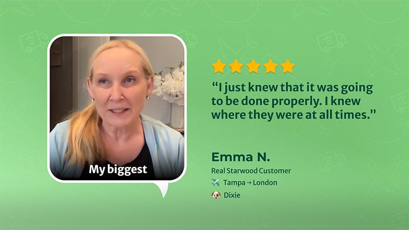 I had a wonderful experience with Starwood Pet Travel! I loved their different price options for pet transport and never once felt as though my pup wasn't cared for, despite getting the cheapest option. They were amazing, especially Cassidy who was there every step of the way. She answered every single question I had and weathered some unexpected storms. I appreciate her and the Starwood team so much for getting my fur baby to me safely in Scotland. Thank you!!